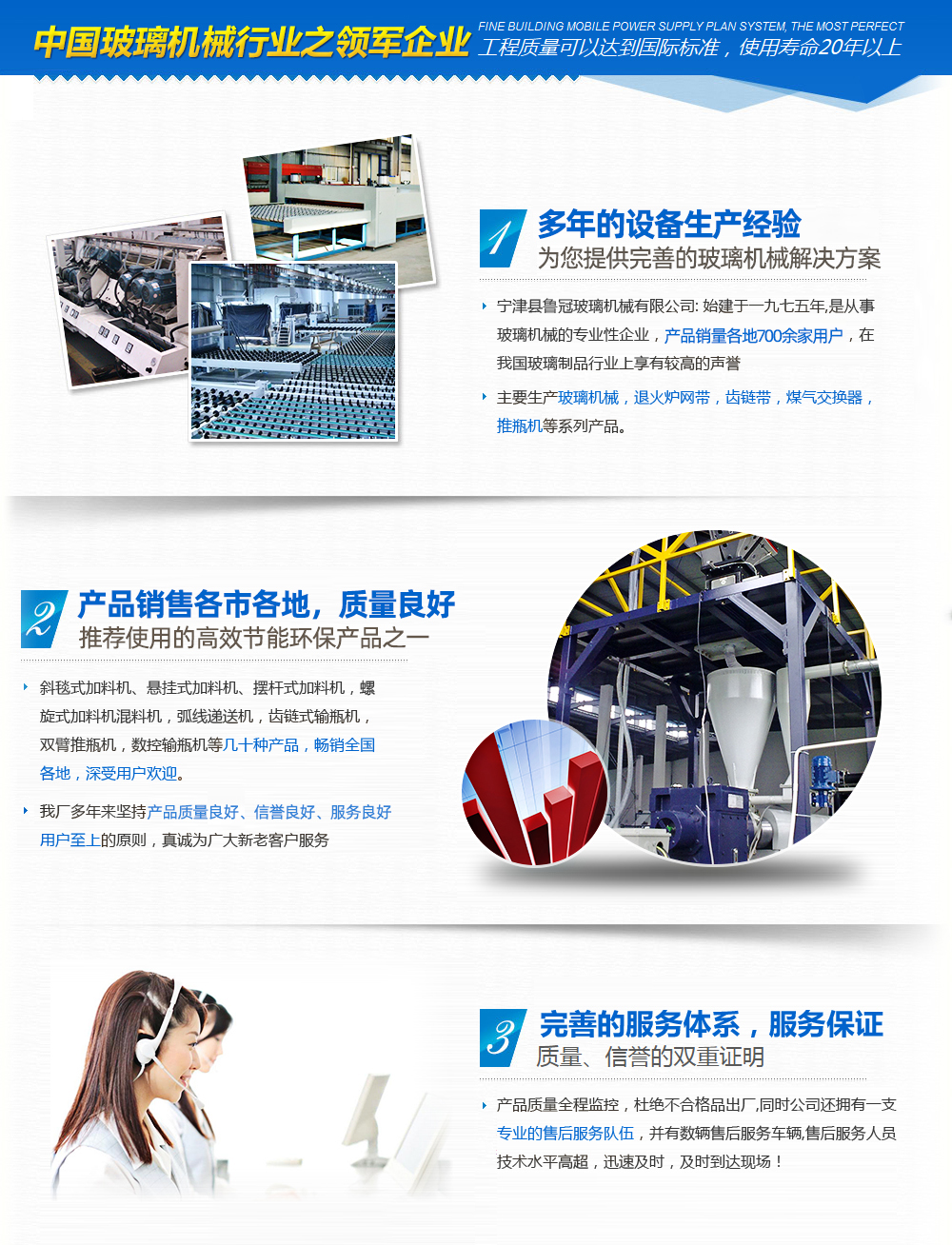 山東魯冠玻璃機械有限公司,是從事玻璃機械的專注性企業(yè),產(chǎn)品行銷各地700余家用戶,在我國玻璃制品行業(yè)上享有較高的聲譽。目前主要生產(chǎn)玻璃加料機,玻璃混料機,煤氣交換器,玻璃原料自動配料等玻璃機械設備。此外,我公司具備良好的整體素質(zhì)和渾厚的技術力量,制造工藝完善,設備完善,具備完善的質(zhì)量管理和質(zhì)量檢測體系。企業(yè)堅持“科學技術是主要生產(chǎn)力”的主導思想,不斷加強新產(chǎn)品研發(fā)力度,玻璃機械產(chǎn)品的開發(fā)生產(chǎn),為適應玻璃制品行業(yè)發(fā)展需要,相繼先后研制出:斜毯式加料機、懸掛式加料機、強制式混合機等幾十種產(chǎn)品,銷售各地,深受用戶歡迎。 我公司產(chǎn)品已實現(xiàn):網(wǎng)帶鏈條、玻璃機械、輸送機械、玻璃原料自動混配、食品機械五大系列。我公司多年來堅持“用戶至上”的原則,真誠為廣大新老客戶服務,竭誠歡迎廣大新老客戶光臨惠顧!